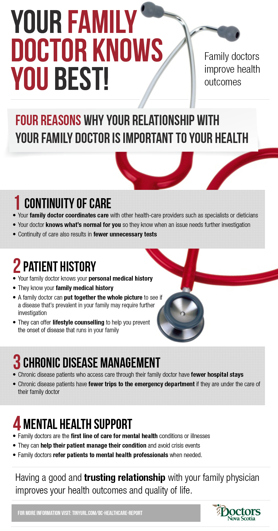 These are just a few ways family doctors contribute to your health and our health-care system. It’s also why Doctors Nova Scotia believes every Nova Scotian should have a family doctor. Your family doctor may provide many other aspects of unique care depending on your unique health profile, their scope of practice, and the depth of the relationship you share.