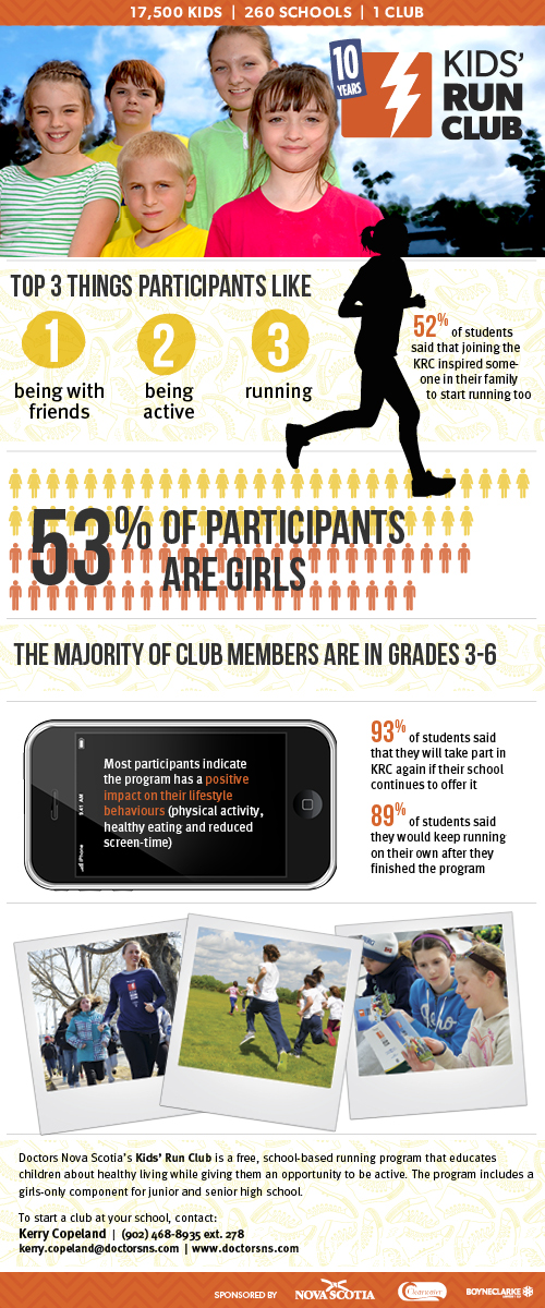 Doctors, youth, parents, coaches, and schools in rural and urban communities have been working together to keep youth active in Nova Scotia for the past ten years. More than 250 schools, spanning the entire province, from Arcadia Consolidated Elementary in Yarmouth to Sydney River Elementary in Cape Breton have implemented the Doctors Nova Scotia Kids’ Run Club.