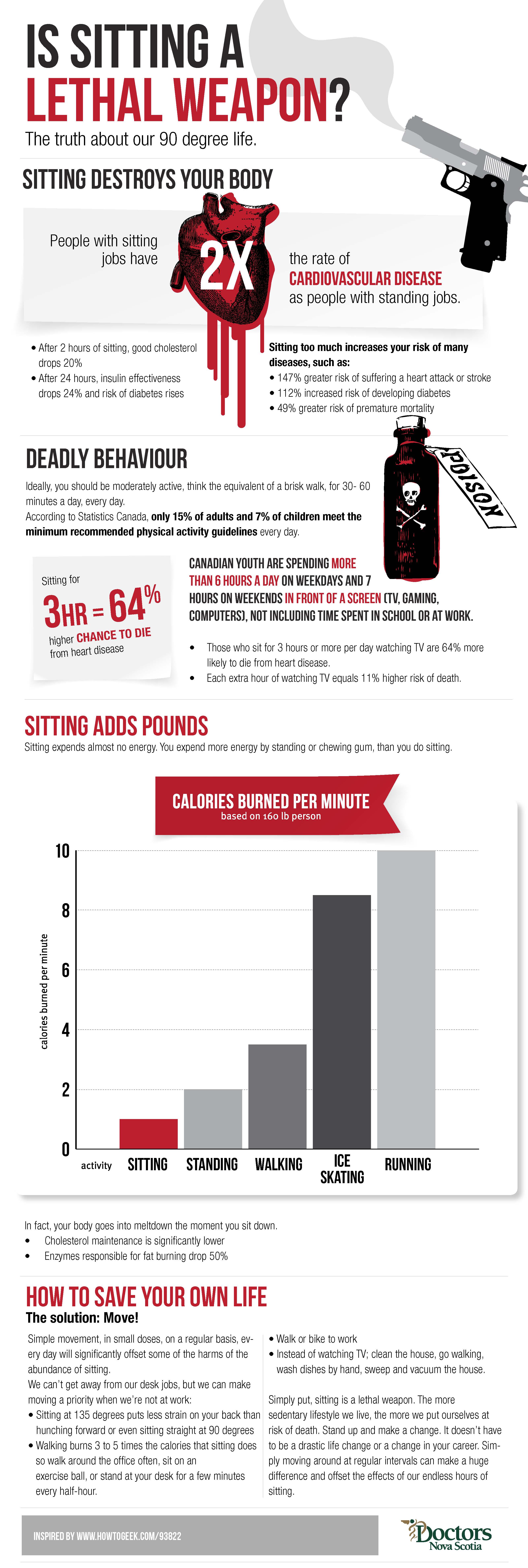 The average Canadian adult spends 50 to 70 per cent of their daily lives in a seated position and another 30 per cent sleeping. Whether at our desks, in our cars, or on the couch, we sit more than we don’t.